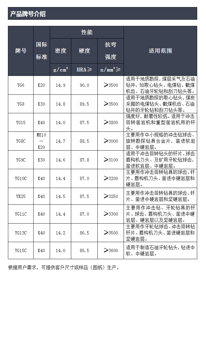 3.硬質(zhì)合金盾構(gòu)刀頭適用于隧道掘進開山破石使用;硬質(zhì)合金球齒廣泛應(yīng)用于石油鉆井及除雪的雪犁設(shè)備中,用于制作高、中、低風(fēng)壓潛孔鉆頭,用于制作開采煤礦的截齒,用于市政工程、道路橋梁等基礎(chǔ)工程建設(shè)、煤礦和其他礦山綜合開采等。